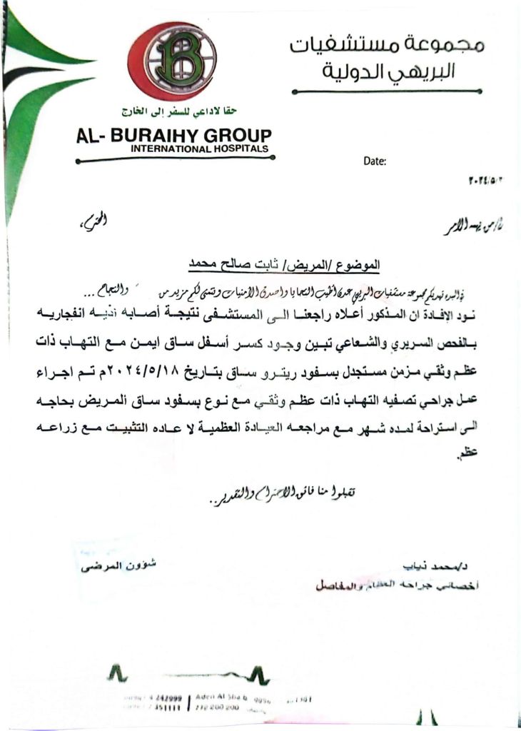 مصاب وتم عمل. مجارحة له. ولكن. حالتة. تحتاج الي متابعة وزراعة عظم
