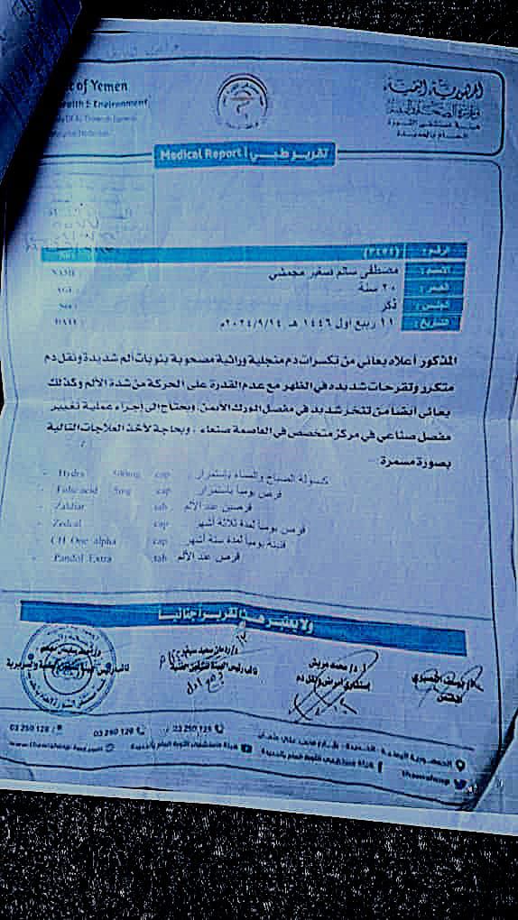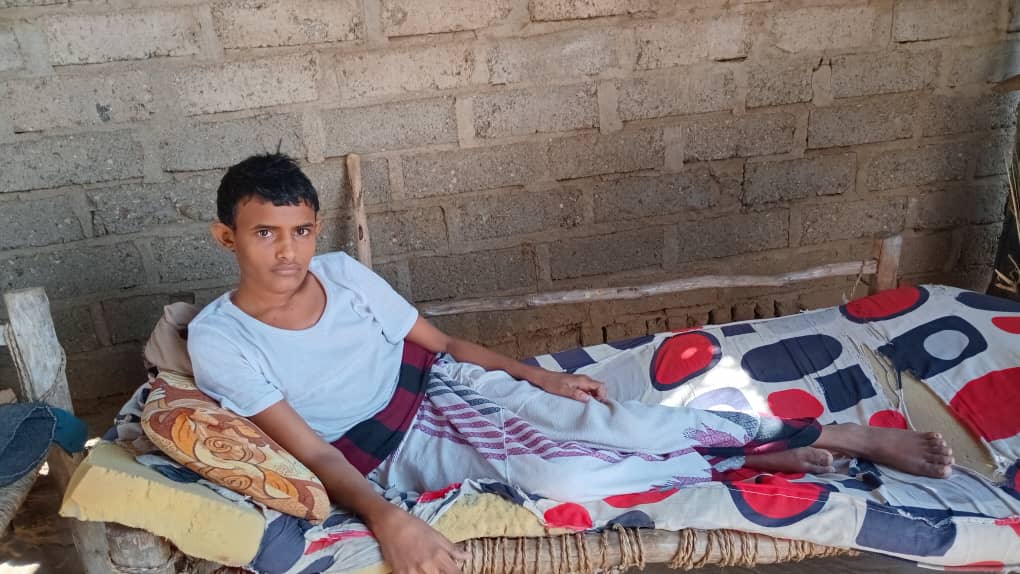 حيث وهو مقعد الفراش منذو عامين. بسبب. تكسرات في الدم. مما نتج عنة تموت في عظمتي الفخذ الايمن والايسر مما ادي الي صعوبة المشي