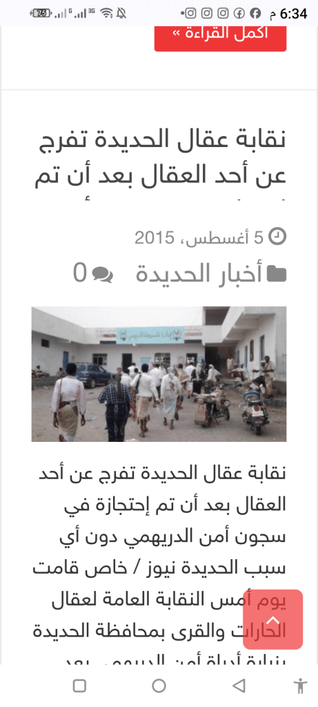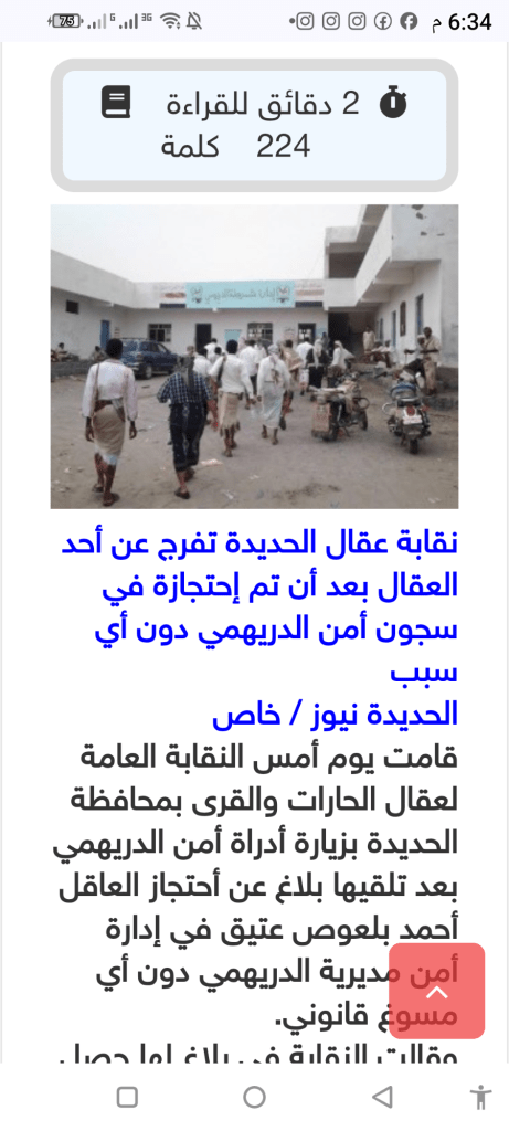 قامت يوم أمس النقابة العامة لعقال الحارات والقرى بمحافظة الحديدة بزيارة أدراة أمن الدريهمي بعد تلقيها بلاغ عن أحتجاز العاقل أحمد بلعوص عتيق في إدارة أمن مديرية الدريهمي دون أي مسوغ قانوني.