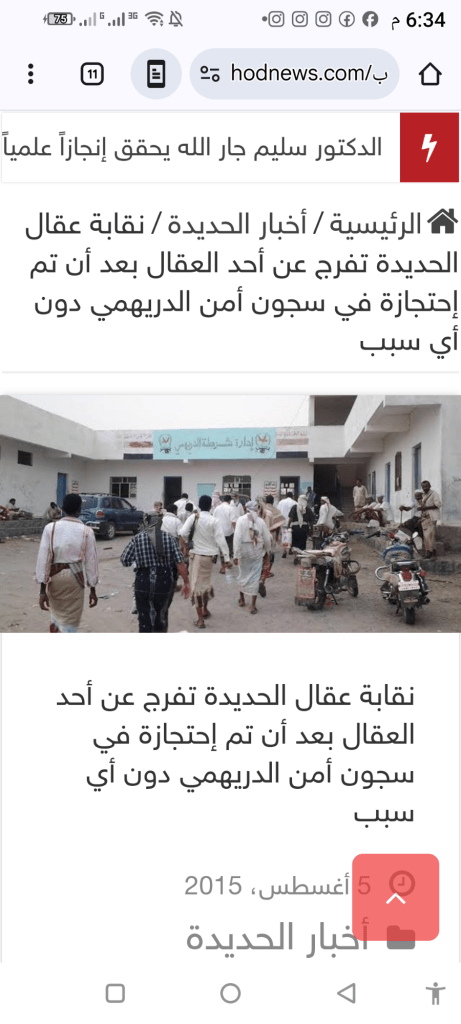 وأشارت النقابة بأنها توجهت لمتابعة قضية العاقل احمد بلعوص منسق النقابه العامة للعقال بمديرية الدريهمي المحبوس لدى أدارة أمن الدريهمي ..