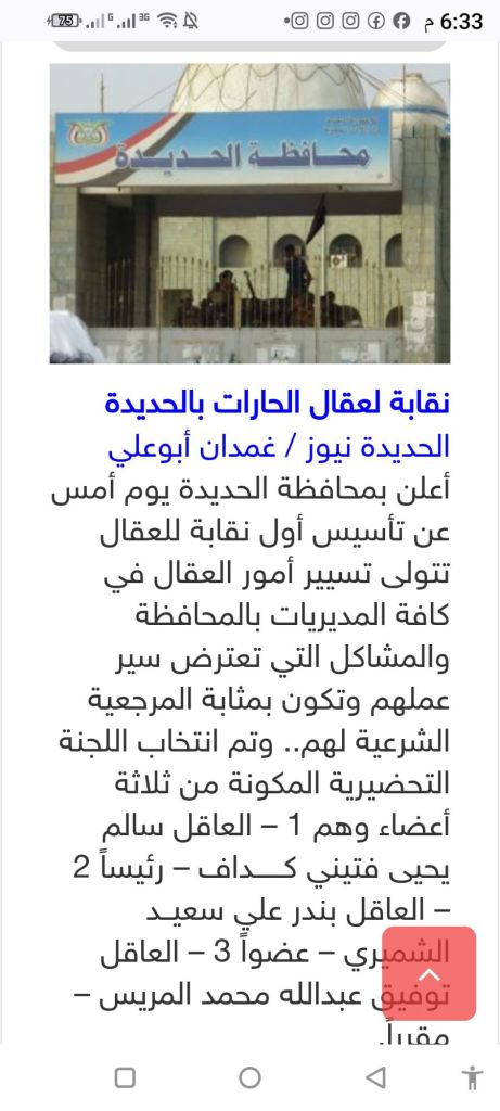 نقابة لعقال الحارات بالحديدةالحديدة نيوز / غمدان أبوعليأعلن بمحافظة الحديدة يوم أمس عن تأسيس أول نقابة للعقال تتولى تسيير أمور العقال في كافة المديريات بالمحافظة والمشاكل التي تعترض سير عملهم وتكون بمثابة المرجعية الشرعية لهم.. وتم انتخاب اللجنة التحضيرية المكونة من ثلاثة أعضاء وهم 1 – العاقل سالم يحيى فتيني كــــــداف – رئيساً 2 – العاقل بندر علي سعيــد الشميري – عضواً 3 – العاقل توفيق عبدالله محمد المريس – مقرراً.وعن الهدف من تأسيس النقابة أوضح لـ ” الحديدة نيوز ” العاقل بندر علي الشميري بأن نقابة عقال الحارات تسعى الى حفظ حقوقهم وتعزيز مكانتهم ودورهم كعقال في المجتمع، الأمر الذي جعلهم يفكرون بالأمر مما يعانوه من تهميش واستغلال ولامبالاة برغم أهميتهم وكبر دورهم الفعلي في النظام بصفتهم جزءاً منه كمأموري الضبط القضائي.وأشار الى أنهم قاموا بتأسيس النقابة لتكون نقابة مهنية مستقلة تعزز من مكانتهم وتحفظ حقوقهم وتقوي اللحمة والترابط فيما بينهم.