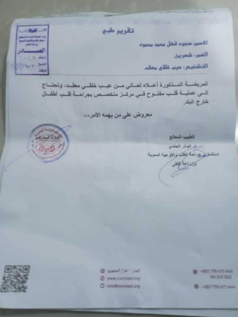 يا أخي العزيز هذه الحالة من الخوخة طفله تحتاج عملية. قلب مفتوح. تحتاح مساعده من فاعلين الخير جزاكم الله خيرا